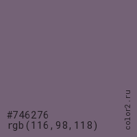 Цвет #746276 в цветовой модели RGB обозначается тремя октетами (116, 98, 118) в десятичном формате и #746276 в шестнадцатиричном (hex) формате, которые являются интенсивностью красного 116 (hex 74), интенсивность зелёного 98 (hex 62) и интенсивность синего 118 (hex 76).