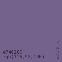 Цвет #74628C в цветовой модели RGB обозначается тремя октетами (116, 98, 140) в десятичном формате и #74628C в шестнадцатиричном (hex) формате, которые являются интенсивностью красного 116 (hex 74), интенсивность зелёного 98 (hex 62) и интенсивность синего 140 (hex 8C).