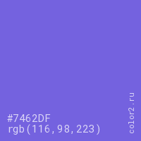 Цвет #7462DF в цветовой модели RGB обозначается тремя октетами (116, 98, 223) в десятичном формате и #7462DF в шестнадцатиричном (hex) формате, которые являются интенсивностью красного 116 (hex 74), интенсивность зелёного 98 (hex 62) и интенсивность синего 223 (hex DF).