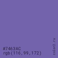 Цвет #7463AC в цветовой модели RGB обозначается тремя октетами (116, 99, 172) в десятичном формате и #7463AC в шестнадцатиричном (hex) формате, которые являются интенсивностью красного 116 (hex 74), интенсивность зелёного 99 (hex 63) и интенсивность синего 172 (hex AC).