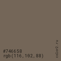 Цвет #746658 в цветовой модели RGB обозначается тремя октетами (116, 102, 88) в десятичном формате и #746658 в шестнадцатиричном (hex) формате, которые являются интенсивностью красного 116 (hex 74), интенсивность зелёного 102 (hex 66) и интенсивность синего 88 (hex 58).