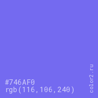 Цвет #746AF0 в цветовой модели RGB обозначается тремя октетами (116, 106, 240) в десятичном формате и #746AF0 в шестнадцатиричном (hex) формате, которые являются интенсивностью красного 116 (hex 74), интенсивность зелёного 106 (hex 6A) и интенсивность синего 240 (hex F0).