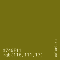 Цвет #746F11 в цветовой модели RGB обозначается тремя октетами (116, 111, 17) в десятичном формате и #746F11 в шестнадцатиричном (hex) формате, которые являются интенсивностью красного 116 (hex 74), интенсивность зелёного 111 (hex 6F) и интенсивность синего 17 (hex 11).