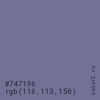 Цвет #747196 в цветовой модели RGB обозначается тремя октетами (116, 113, 150) в десятичном формате и #747196 в шестнадцатиричном (hex) формате, которые являются интенсивностью красного 116 (hex 74), интенсивность зелёного 113 (hex 71) и интенсивность синего 150 (hex 96).