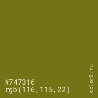 Цвет #747316 в цветовой модели RGB обозначается тремя октетами (116, 115, 22) в десятичном формате и #747316 в шестнадцатиричном (hex) формате, которые являются интенсивностью красного 116 (hex 74), интенсивность зелёного 115 (hex 73) и интенсивность синего 22 (hex 16).