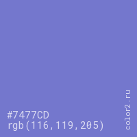 Цвет #7477CD в цветовой модели RGB обозначается тремя октетами (116, 119, 205) в десятичном формате и #7477CD в шестнадцатиричном (hex) формате, которые являются интенсивностью красного 116 (hex 74), интенсивность зелёного 119 (hex 77) и интенсивность синего 205 (hex CD).