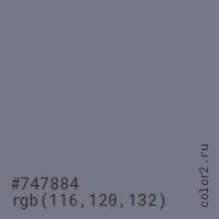 Цвет #747884 в цветовой модели RGB обозначается тремя октетами (116, 120, 132) в десятичном формате и #747884 в шестнадцатиричном (hex) формате, которые являются интенсивностью красного 116 (hex 74), интенсивность зелёного 120 (hex 78) и интенсивность синего 132 (hex 84).