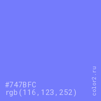 Цвет #747BFC в цветовой модели RGB обозначается тремя октетами (116, 123, 252) в десятичном формате и #747BFC в шестнадцатиричном (hex) формате, которые являются интенсивностью красного 116 (hex 74), интенсивность зелёного 123 (hex 7B) и интенсивность синего 252 (hex FC).