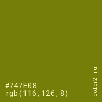 Цвет #747E08 в цветовой модели RGB обозначается тремя октетами (116, 126, 8) в десятичном формате и #747E08 в шестнадцатиричном (hex) формате, которые являются интенсивностью красного 116 (hex 74), интенсивность зелёного 126 (hex 7E) и интенсивность синего 8 (hex 08).