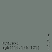 Цвет #747E79 в цветовой модели RGB обозначается тремя октетами (116, 126, 121) в десятичном формате и #747E79 в шестнадцатиричном (hex) формате, которые являются интенсивностью красного 116 (hex 74), интенсивность зелёного 126 (hex 7E) и интенсивность синего 121 (hex 79).
