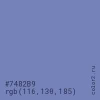 Цвет #7482B9 в цветовой модели RGB обозначается тремя октетами (116, 130, 185) в десятичном формате и #7482B9 в шестнадцатиричном (hex) формате, которые являются интенсивностью красного 116 (hex 74), интенсивность зелёного 130 (hex 82) и интенсивность синего 185 (hex B9).