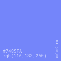 Цвет #7485FA в цветовой модели RGB обозначается тремя октетами (116, 133, 250) в десятичном формате и #7485FA в шестнадцатиричном (hex) формате, которые являются интенсивностью красного 116 (hex 74), интенсивность зелёного 133 (hex 85) и интенсивность синего 250 (hex FA).