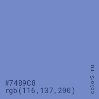 Цвет #7489C8 в цветовой модели RGB обозначается тремя октетами (116, 137, 200) в десятичном формате и #7489C8 в шестнадцатиричном (hex) формате, которые являются интенсивностью красного 116 (hex 74), интенсивность зелёного 137 (hex 89) и интенсивность синего 200 (hex C8).