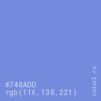 Цвет #748ADD в цветовой модели RGB обозначается тремя октетами (116, 138, 221) в десятичном формате и #748ADD в шестнадцатиричном (hex) формате, которые являются интенсивностью красного 116 (hex 74), интенсивность зелёного 138 (hex 8A) и интенсивность синего 221 (hex DD).