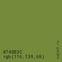 Цвет #748B3C в цветовой модели RGB обозначается тремя октетами (116, 139, 60) в десятичном формате и #748B3C в шестнадцатиричном (hex) формате, которые являются интенсивностью красного 116 (hex 74), интенсивность зелёного 139 (hex 8B) и интенсивность синего 60 (hex 3C).