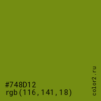 Цвет #748D12 в цветовой модели RGB обозначается тремя октетами (116, 141, 18) в десятичном формате и #748D12 в шестнадцатиричном (hex) формате, которые являются интенсивностью красного 116 (hex 74), интенсивность зелёного 141 (hex 8D) и интенсивность синего 18 (hex 12).