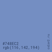 Цвет #748EC2 в цветовой модели RGB обозначается тремя октетами (116, 142, 194) в десятичном формате и #748EC2 в шестнадцатиричном (hex) формате, которые являются интенсивностью красного 116 (hex 74), интенсивность зелёного 142 (hex 8E) и интенсивность синего 194 (hex C2).