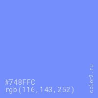 Цвет #748FFC в цветовой модели RGB обозначается тремя октетами (116, 143, 252) в десятичном формате и #748FFC в шестнадцатиричном (hex) формате, которые являются интенсивностью красного 116 (hex 74), интенсивность зелёного 143 (hex 8F) и интенсивность синего 252 (hex FC).