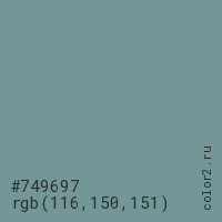 Цвет #749697 в цветовой модели RGB обозначается тремя октетами (116, 150, 151) в десятичном формате и #749697 в шестнадцатиричном (hex) формате, которые являются интенсивностью красного 116 (hex 74), интенсивность зелёного 150 (hex 96) и интенсивность синего 151 (hex 97).