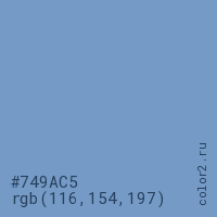 Цвет #749AC5 в цветовой модели RGB обозначается тремя октетами (116, 154, 197) в десятичном формате и #749AC5 в шестнадцатиричном (hex) формате, которые являются интенсивностью красного 116 (hex 74), интенсивность зелёного 154 (hex 9A) и интенсивность синего 197 (hex C5).