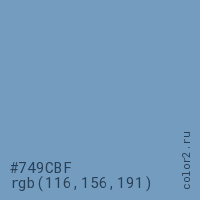 Цвет #749CBF в цветовой модели RGB обозначается тремя октетами (116, 156, 191) в десятичном формате и #749CBF в шестнадцатиричном (hex) формате, которые являются интенсивностью красного 116 (hex 74), интенсивность зелёного 156 (hex 9C) и интенсивность синего 191 (hex BF).