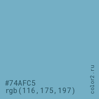 Цвет #74AFC5 в цветовой модели RGB обозначается тремя октетами (116, 175, 197) в десятичном формате и #74AFC5 в шестнадцатиричном (hex) формате, которые являются интенсивностью красного 116 (hex 74), интенсивность зелёного 175 (hex AF) и интенсивность синего 197 (hex C5).