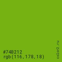 Цвет #74B212 в цветовой модели RGB обозначается тремя октетами (116, 178, 18) в десятичном формате и #74B212 в шестнадцатиричном (hex) формате, которые являются интенсивностью красного 116 (hex 74), интенсивность зелёного 178 (hex B2) и интенсивность синего 18 (hex 12).