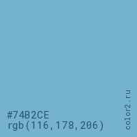 Цвет #74B2CE в цветовой модели RGB обозначается тремя октетами (116, 178, 206) в десятичном формате и #74B2CE в шестнадцатиричном (hex) формате, которые являются интенсивностью красного 116 (hex 74), интенсивность зелёного 178 (hex B2) и интенсивность синего 206 (hex CE).