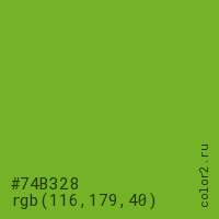 Цвет #74B328 в цветовой модели RGB обозначается тремя октетами (116, 179, 40) в десятичном формате и #74B328 в шестнадцатиричном (hex) формате, которые являются интенсивностью красного 116 (hex 74), интенсивность зелёного 179 (hex B3) и интенсивность синего 40 (hex 28).