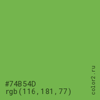 Цвет #74B54D в цветовой модели RGB обозначается тремя октетами (116, 181, 77) в десятичном формате и #74B54D в шестнадцатиричном (hex) формате, которые являются интенсивностью красного 116 (hex 74), интенсивность зелёного 181 (hex B5) и интенсивность синего 77 (hex 4D).