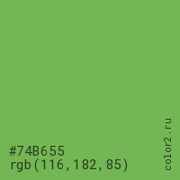Цвет #74B655 в цветовой модели RGB обозначается тремя октетами (116, 182, 85) в десятичном формате и #74B655 в шестнадцатиричном (hex) формате, которые являются интенсивностью красного 116 (hex 74), интенсивность зелёного 182 (hex B6) и интенсивность синего 85 (hex 55).