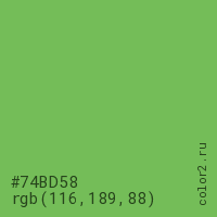 Цвет #74BD58 в цветовой модели RGB обозначается тремя октетами (116, 189, 88) в десятичном формате и #74BD58 в шестнадцатиричном (hex) формате, которые являются интенсивностью красного 116 (hex 74), интенсивность зелёного 189 (hex BD) и интенсивность синего 88 (hex 58).
