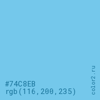 Цвет #74C8EB в цветовой модели RGB обозначается тремя октетами (116, 200, 235) в десятичном формате и #74C8EB в шестнадцатиричном (hex) формате, которые являются интенсивностью красного 116 (hex 74), интенсивность зелёного 200 (hex C8) и интенсивность синего 235 (hex EB).