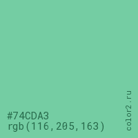Цвет #74CDA3 в цветовой модели RGB обозначается тремя октетами (116, 205, 163) в десятичном формате и #74CDA3 в шестнадцатиричном (hex) формате, которые являются интенсивностью красного 116 (hex 74), интенсивность зелёного 205 (hex CD) и интенсивность синего 163 (hex A3).