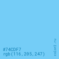 Цвет #74CDF7 в цветовой модели RGB обозначается тремя октетами (116, 205, 247) в десятичном формате и #74CDF7 в шестнадцатиричном (hex) формате, которые являются интенсивностью красного 116 (hex 74), интенсивность зелёного 205 (hex CD) и интенсивность синего 247 (hex F7).