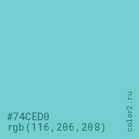 Цвет #74CED0 в цветовой модели RGB обозначается тремя октетами (116, 206, 208) в десятичном формате и #74CED0 в шестнадцатиричном (hex) формате, которые являются интенсивностью красного 116 (hex 74), интенсивность зелёного 206 (hex CE) и интенсивность синего 208 (hex D0).