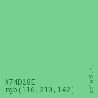 Цвет #74D28E в цветовой модели RGB обозначается тремя октетами (116, 210, 142) в десятичном формате и #74D28E в шестнадцатиричном (hex) формате, которые являются интенсивностью красного 116 (hex 74), интенсивность зелёного 210 (hex D2) и интенсивность синего 142 (hex 8E).