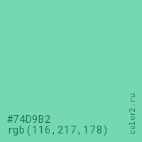 Цвет #74D9B2 в цветовой модели RGB обозначается тремя октетами (116, 217, 178) в десятичном формате и #74D9B2 в шестнадцатиричном (hex) формате, которые являются интенсивностью красного 116 (hex 74), интенсивность зелёного 217 (hex D9) и интенсивность синего 178 (hex B2).