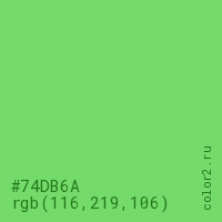 Цвет #74DB6A в цветовой модели RGB обозначается тремя октетами (116, 219, 106) в десятичном формате и #74DB6A в шестнадцатиричном (hex) формате, которые являются интенсивностью красного 116 (hex 74), интенсивность зелёного 219 (hex DB) и интенсивность синего 106 (hex 6A).