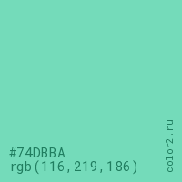 Цвет #74DBBA в цветовой модели RGB обозначается тремя октетами (116, 219, 186) в десятичном формате и #74DBBA в шестнадцатиричном (hex) формате, которые являются интенсивностью красного 116 (hex 74), интенсивность зелёного 219 (hex DB) и интенсивность синего 186 (hex BA).