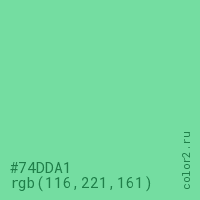 Цвет #74DDA1 в цветовой модели RGB обозначается тремя октетами (116, 221, 161) в десятичном формате и #74DDA1 в шестнадцатиричном (hex) формате, которые являются интенсивностью красного 116 (hex 74), интенсивность зелёного 221 (hex DD) и интенсивность синего 161 (hex A1).