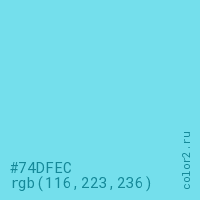 Цвет #74DFEC в цветовой модели RGB обозначается тремя октетами (116, 223, 236) в десятичном формате и #74DFEC в шестнадцатиричном (hex) формате, которые являются интенсивностью красного 116 (hex 74), интенсивность зелёного 223 (hex DF) и интенсивность синего 236 (hex EC).