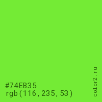 Цвет #74EB35 в цветовой модели RGB обозначается тремя октетами (116, 235, 53) в десятичном формате и #74EB35 в шестнадцатиричном (hex) формате, которые являются интенсивностью красного 116 (hex 74), интенсивность зелёного 235 (hex EB) и интенсивность синего 53 (hex 35).