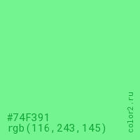 Цвет #74F391 в цветовой модели RGB обозначается тремя октетами (116, 243, 145) в десятичном формате и #74F391 в шестнадцатиричном (hex) формате, которые являются интенсивностью красного 116 (hex 74), интенсивность зелёного 243 (hex F3) и интенсивность синего 145 (hex 91).