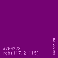 Цвет #750273 в цветовой модели RGB обозначается тремя октетами (117, 2, 115) в десятичном формате и #750273 в шестнадцатиричном (hex) формате, которые являются интенсивностью красного 117 (hex 75), интенсивность зелёного 2 (hex 02) и интенсивность синего 115 (hex 73).