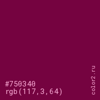 Цвет #750340 в цветовой модели RGB обозначается тремя октетами (117, 3, 64) в десятичном формате и #750340 в шестнадцатиричном (hex) формате, которые являются интенсивностью красного 117 (hex 75), интенсивность зелёного 3 (hex 03) и интенсивность синего 64 (hex 40).