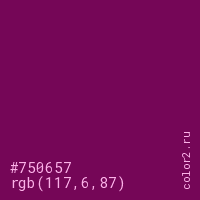 Цвет #750657 в цветовой модели RGB обозначается тремя октетами (117, 6, 87) в десятичном формате и #750657 в шестнадцатиричном (hex) формате, которые являются интенсивностью красного 117 (hex 75), интенсивность зелёного 6 (hex 06) и интенсивность синего 87 (hex 57).