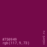 Цвет #750949 в цветовой модели RGB обозначается тремя октетами (117, 9, 73) в десятичном формате и #750949 в шестнадцатиричном (hex) формате, которые являются интенсивностью красного 117 (hex 75), интенсивность зелёного 9 (hex 09) и интенсивность синего 73 (hex 49).