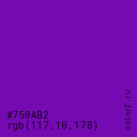 Цвет #750AB2 в цветовой модели RGB обозначается тремя октетами (117, 10, 178) в десятичном формате и #750AB2 в шестнадцатиричном (hex) формате, которые являются интенсивностью красного 117 (hex 75), интенсивность зелёного 10 (hex 0A) и интенсивность синего 178 (hex B2).