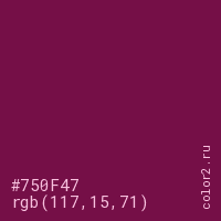 Цвет #750F47 в цветовой модели RGB обозначается тремя октетами (117, 15, 71) в десятичном формате и #750F47 в шестнадцатиричном (hex) формате, которые являются интенсивностью красного 117 (hex 75), интенсивность зелёного 15 (hex 0F) и интенсивность синего 71 (hex 47).